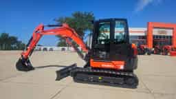 New 2025 Kubota KX057-5 5.7-ton mini excavator. This machine features a full cab with heat and A/C, as well as a thumb, angle blade, and 30″ bucket.